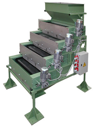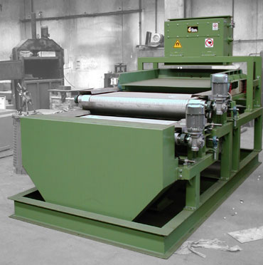 Działanie: materiał jest równomiernie podawany do kosza zasypowego i rozkładany na cienką warstwę na przenośniku taśmowym. Separator magnetyczny w postaci rolki przyciąga cząstki wrażliwe magnetycznie i odrzuca je na bok podczas, gdy materiał obojętny przesuwa się do zsypu, W zależności od składu chemicznego materiału, konieczne może być zastosowanie kilku stopni separacji.
