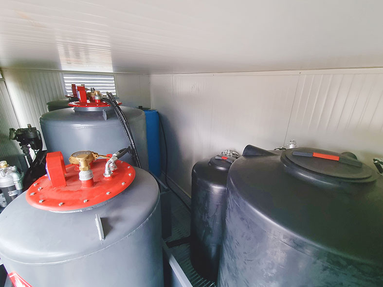Do bezpiecznego magazynowania poza halą zbiorników z płynami, olejami i paliwem usuniętym z samochodów, polecane są kontenery IRIS-MEC: model BMC2-C o wym. 2400x 500x2400mm, model BMC 4 o wym. 4000x2000x2400mm oraz model BMC 5 o wym. 5000x2000x2400mm. Kontenery posiadaję podłogę wykonaną z antypoślizgowych kratownic i misę ociekową do wychwytywania ewentualnych wycieków płynów ze zbiorników. Szeroko rozsuwane drzwi umożliwiają łatwe opróżnianie zbiorników. Gotowe otwory w tylnej ścianie służą do wprowadzenie przewodów i rur łączących stanowiska osuszania pojazdów ze zbiornikami magazynowymi.